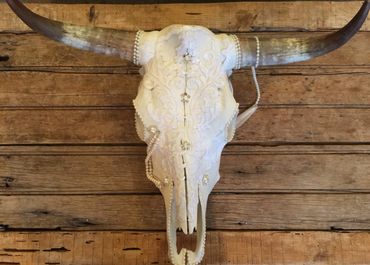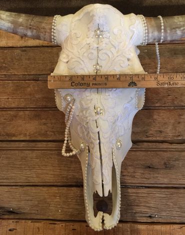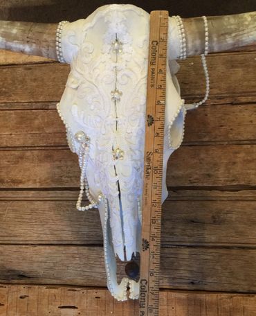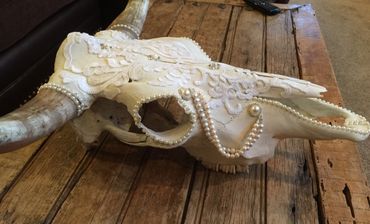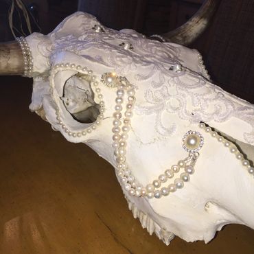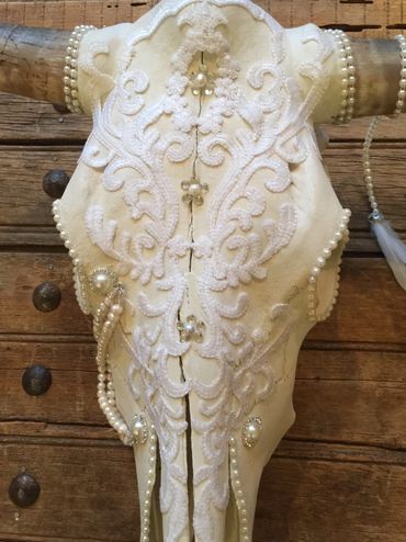 Bull skull, cotton lace, freshwater pearls, Swarovski crystals, faux pearls, rhinestones, feathers
